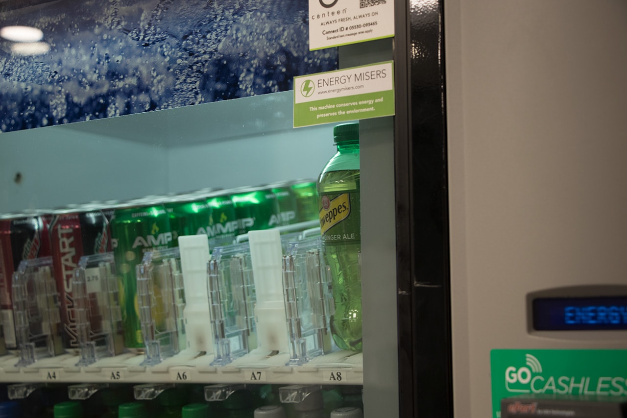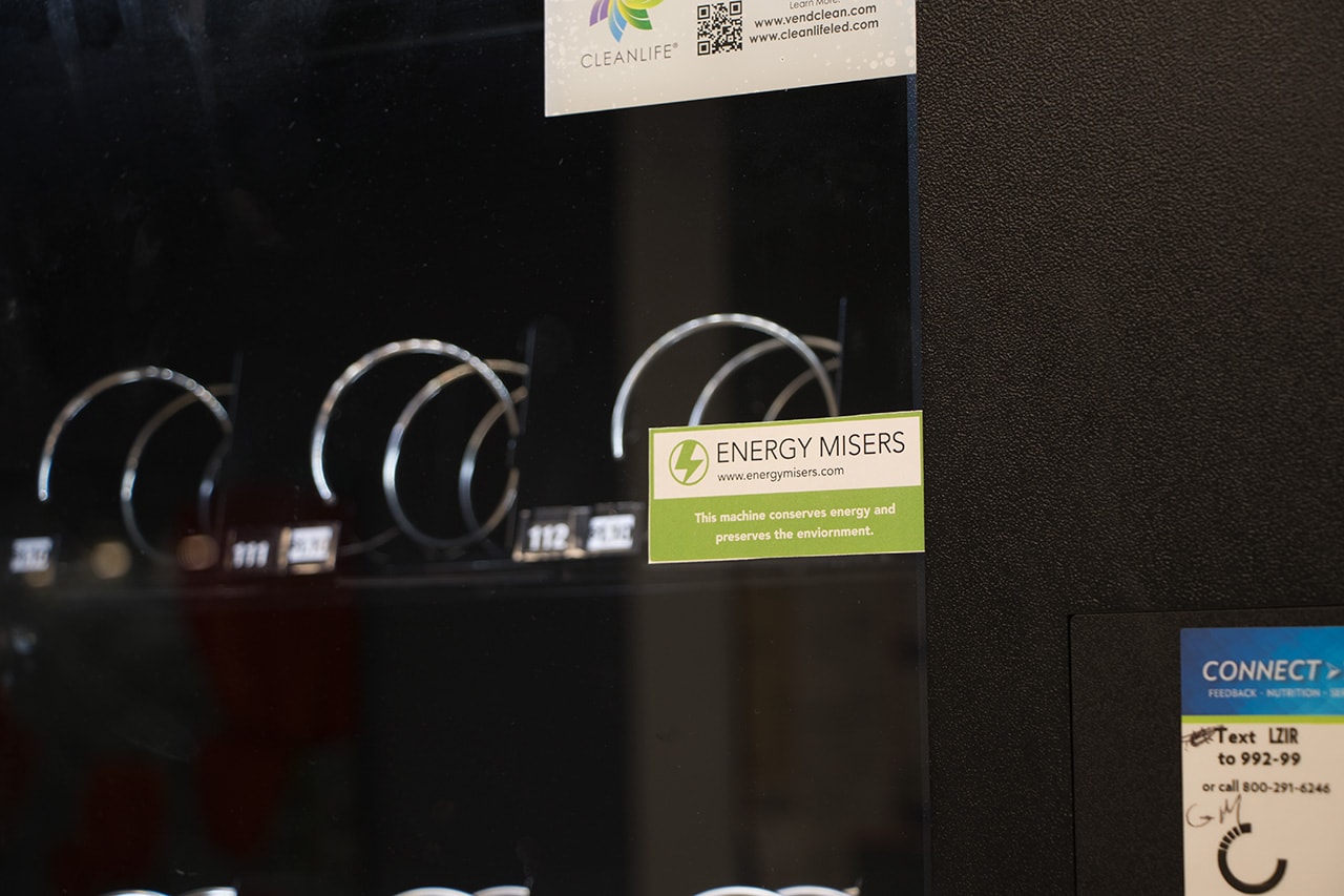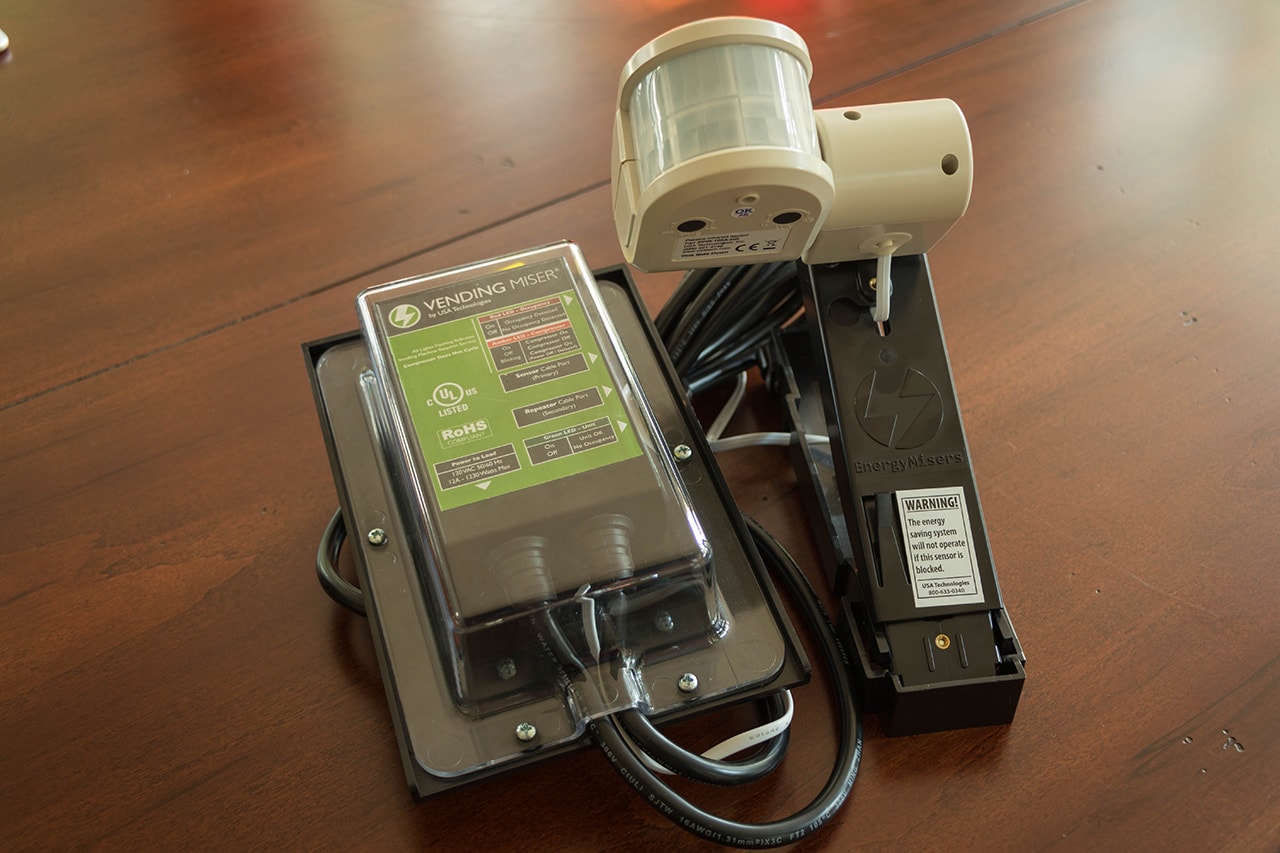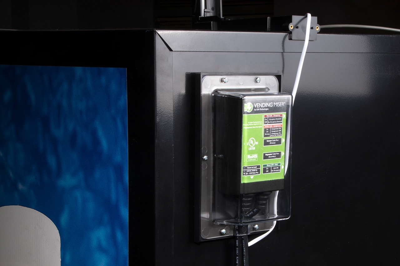 Like the one shown on the right, use a controller and a machine or wall-mounted sensor to monitor room occupancy and temperature. If 15 minutes pass without any pedestrian traffic, the EnergyMiser will power down the machine. The machine is powered back up when people return and at regular intervals to keep the product cold. External controllers are best suited for low traffic areas.